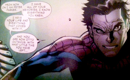 2. Give it a year. Sales will lag (or they won’t) and Marvel will retcon this whole thing by claiming “Peter” was really Identity Crisis’ Ben Reilly. The real Peter and the Doc Peter will have a huge battle and then the real Peter will assume the mantle again, and Doctor Octopus will have some secret clone he will transfer his mind into. This whole storyline reminds me of Woo’s Face/Off with Travolta and Cage. It’s a bold move and an interesting diversion, but there’s only one outcome for a AAA title: the hero wins in the end. Peter will be back.