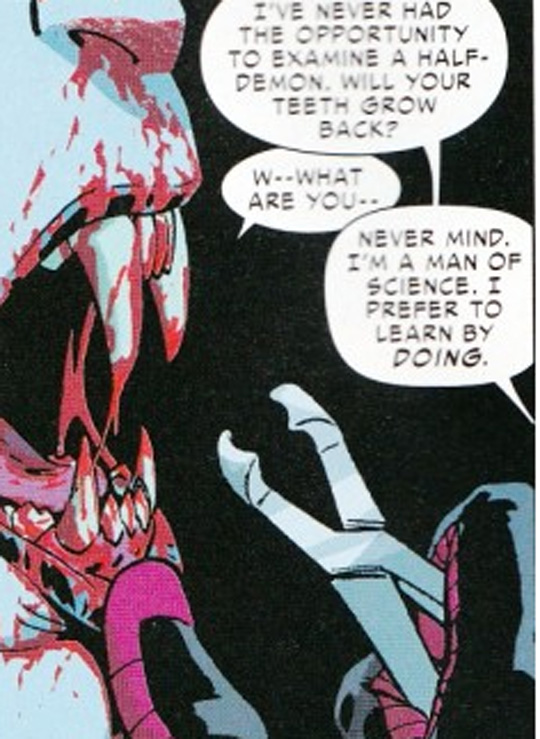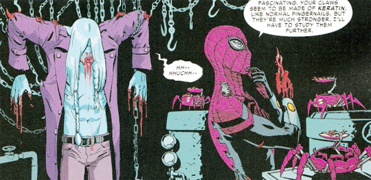 In today’s Superior Spider-Man, the character goes a little further. Into full blown Nazi-like torture/experimentation on his victims. By ripping out teeth and fingernails…