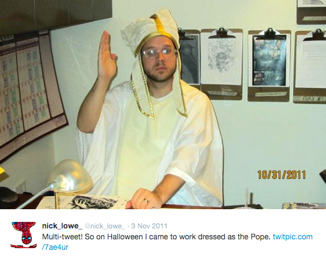 Marvel Senior Editor Nick Lowe is the type of guy who dresses up as the pope on Halloween because he’s scared to death of what would happen if he pranced around the office as an imam or Mohammed. Marvel Senior Editor Nick Lowe is the type of guy who dresses as the pope for Halloween because Dan Slott would probably not find it funny to see his editor mock Orthodox Jew rabbis on Halloween. Marvel Senior Editor Nick Lowe is also the kind of guy who needlessly burns bridges with loyal Marvel customers in the Letters to the Editor section of The Amazing Spider-Man.