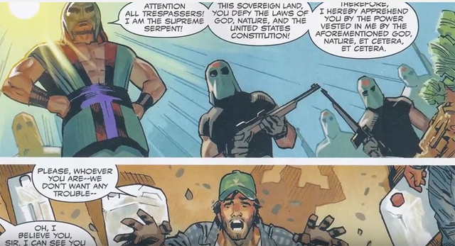 In the issue, Captain America beats up members of a white supremacist militia called the Sons of the Serpent as they attempt to apprehend a group of illegal aliens crossing the desert from Mexico into Arizona.