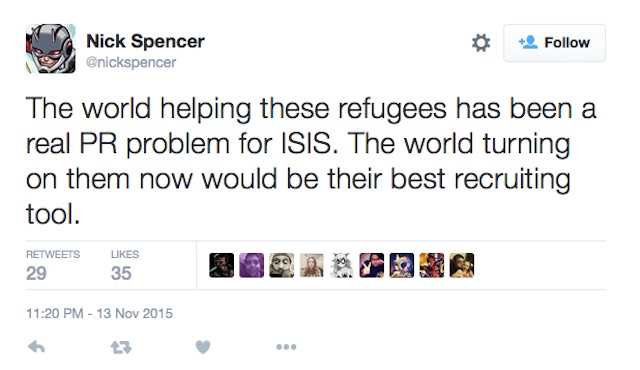 Marvel’s Nick Spencer used the Paris terror attacks on Friday as an opportunity to remind the world of its duty to accept millions of refugees from the Middle East and North Africa.