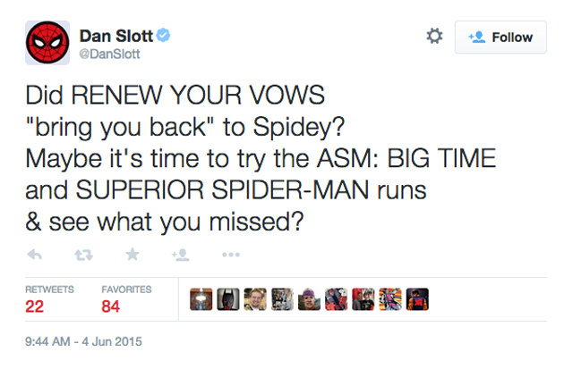 Marvel writer Dan Slott has a reputation for weird behavior online. There was the time he stalked The Main Event. There was the time he searched out a random woman to troll on Twitter and made jokes about the quality of her life. He has now taken it to the next level. Dan Slott is simultaneously stalking Twitter accounts he has blocked while telling his fans that the people he is stalking are “crazy.” The Amazing Spider-Man writer cannot get me out of his head, which is why this tweet went up yesterday after my review of Renew Your Vows was posted.