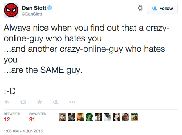 Where are the Dan Slott fat jokes? Where are the Dan Slott Danny Devito jokes? That’s right — they don’t exist in my writing because I don’t “hate” anyone. And if I were inclined to create dummy accounts, then it would be because Twitter recently blocked me after I complained it did nothing (yes, nothing) to the Islamic radical apologist who threatened to kill me.