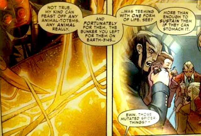 Another bizarre instance occurs when Karn reveals that the nuclear wasteland the Inheritors have been imprisoned on “fortunately” has a bunker “teeming” with spiders. What are the chances? It’s almost like Master Weaver giving the heroes a scroll with “everything” they need to succeed, or Silk conveniently teleporting to the planet and finding the bunker to begin with. Dan Slott’s Peter Parker is big on the “no one dies” mantra, but he’s apparently okay with the “shut you in a bunker and force you to live on spiders for all eternity,” verdict as well. Under normal circumstances such a panel could be laughed off, but since the writer has invested so much in “no one dies” during his tenure, it should not be ignored.